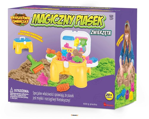 Zestaw zawiera foremki, 600g piasku, siedzisko dla dziecka.