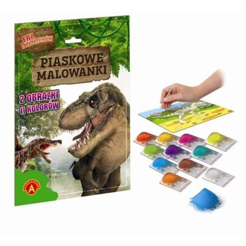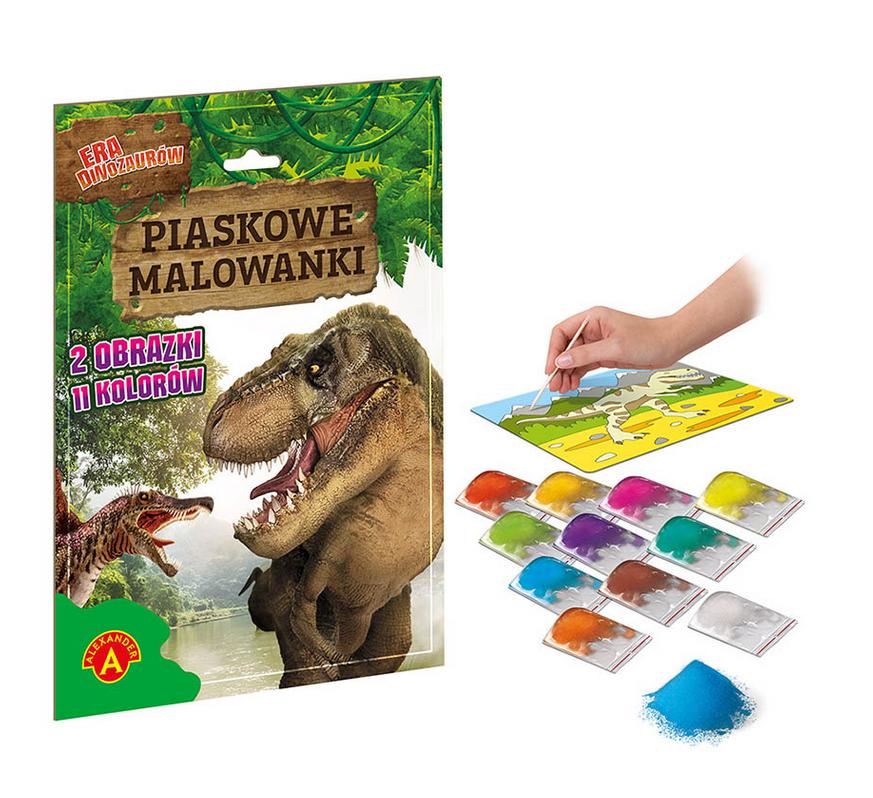 Zostań małym artystą wraz z Tyranozaurem i Stegozaurem. Zabawa polega na odsłanianiu kolejnych, naciętych, elementów obrazka tak, by odkryć klejącą powierzchnię wybranego fragmentu. Następnie posyp go piaskiem w odpowiednim kolorze i gotowe. Twoja własna piaskowa malowanka.