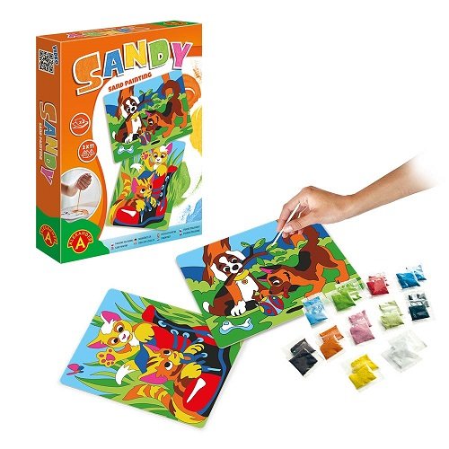 Opis produktuZasady bezpieczeństwaUwielbiana przez dzieci, artystyczna zabawa malowania piaskiem, polegająca na odsłanianiu kolejno poszczególnych, naciętych elementów obrazka, tak by odkryć klejącą powierzchnię. Odsłonięte elementy posypuje się piaskiem, w kolorze zgodnym ze wzorem lub według własnej wyobraźni, tworząc piękną ilustrację. Piaskowe Malowanki wspaniale wpływają na samoocenę dzieci, ponieważ nawet dziecko niemające zdolności artystycznych może stworzyć piękny obrazek. W trakcie zabawy dziecko doskonali swoje zdolności manualne, w tym głównie precyzję ruchów, a także zręczność i koordynację wzrokowo-ruchową. Zabawa z Piaskowymi Malowankami pozytywnie wpływa na prawidłowy rozwój integracji sensorycznej. Co za tym idzie ma niebagatelny wpływ na powstawanie nowych połączeń między neuronami. Produkt mocno wpływa na ćwiczenie koncentracji u najmłodszych. Zaletą zabawki jest wysoka jakość, bogactwo wzorów oraz atrakcyjna cena. Zawartość opakowania: