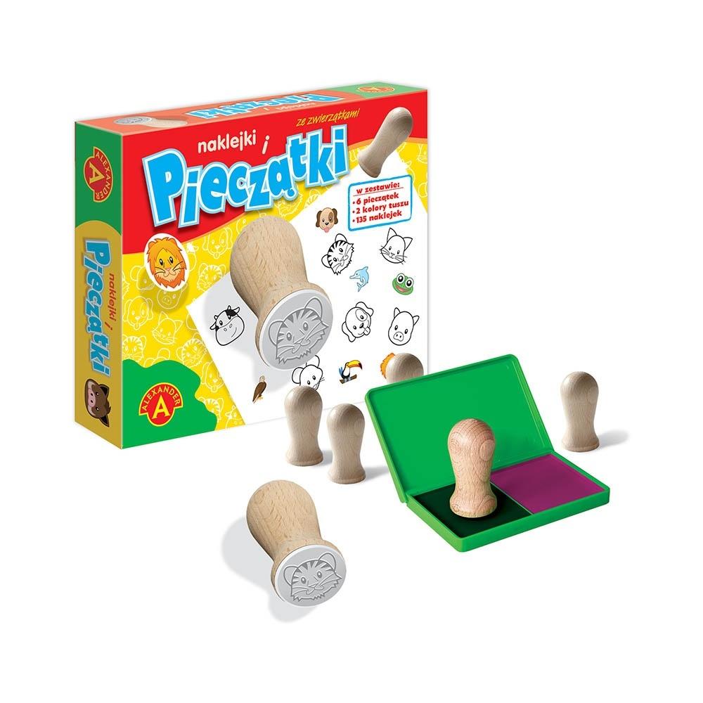 Opis produktuZasady bezpieczeństwaZestaw kreatywny dla dzieci składający się z 6 pieczątek z wzorami zwierzątek (kotek, piesek, myszka, świnka, tygrysek, krówka), które można odbijać na kartce czarnym i czerwonym tuszem z poduszek znajdujących się w specjalnym, plastikowym pudełku. Odbite kształty można kolorować kredkami lub dodatkowo ozdabiać nimi swoje rysunki. 135 kolorowych naklejek urozmaica zabawę. Wszystkie elementy znajdują się w eleganckiej, funkcjonalnej wyprasce. 100% polski produkt wytwarzany w całości w fabryce Alexandra.