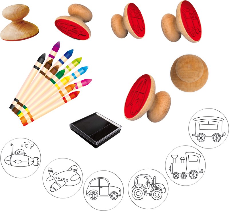 Zestaw 6 drewnianych pieczątek z pojazdami do kolorowania. W pudełku, oprócz stempli, znajduje się zestaw 12 kredek oraz poduszka z tuszem. Kreatywna zabawa dla najmłodszych!
