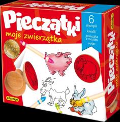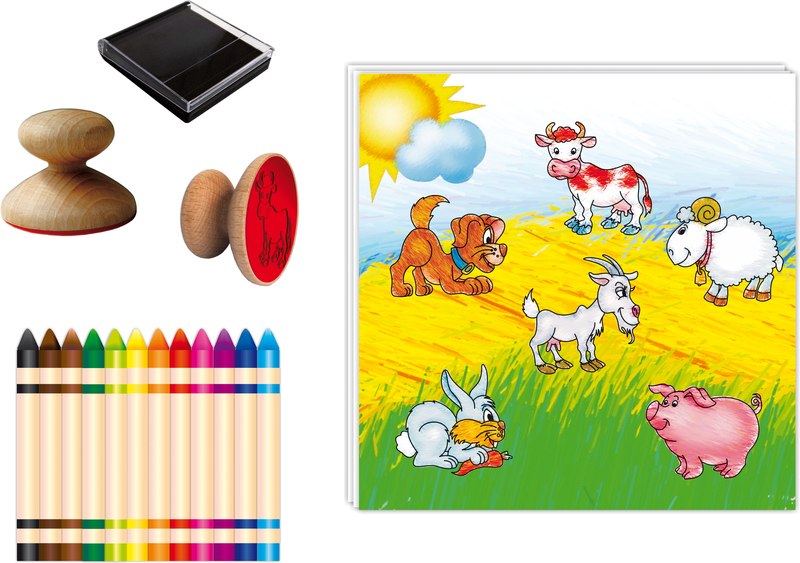 Zestaw 6 drewnianych pieczątek do kolorowania. W pudełku, oprócz stempli, znajduje się blok rysunkowy, zestaw 12 kredek oraz poduszka z tuszem. Kreatywna zabawa dla najmłodszych!