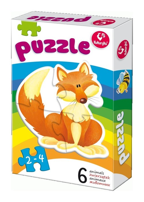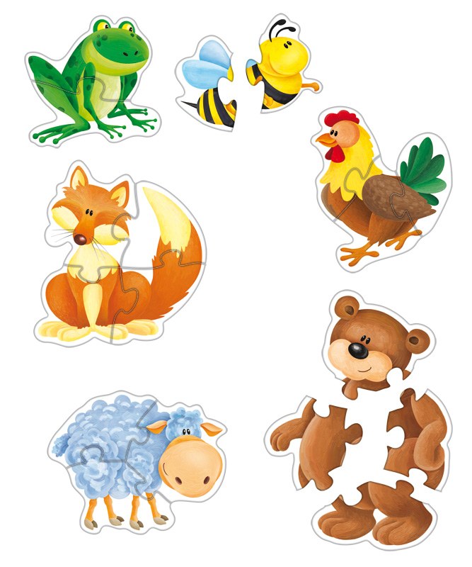 Zwierzątka takie jak żaba, pszczółka są dwuelementowe, pozostałe: trzy i czteroelementowe. Puzzle powinny być używane w miarę postępującego rozwoju możliwości kojarzenia kształtów. Doskonała zabawa edukacyjna dla najmniejszych dzieci. W serii znajdują się również puzzle ze zwierzątkami egzotycznymi oraz pojazdami.