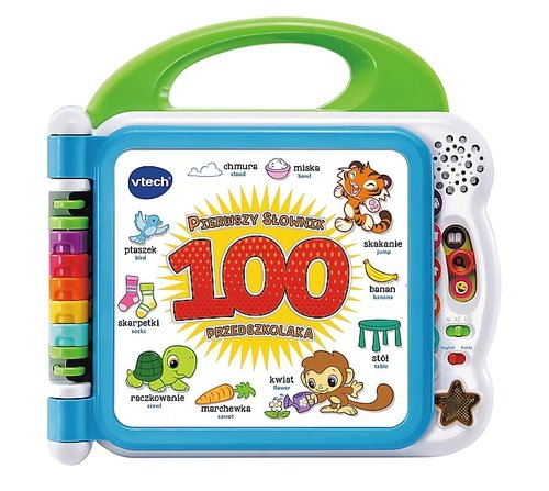Pierwszy słownik przedszkolaka od VTech to wyjątkowa zabawka edukacyjna dla dzieci ciekawych świata! Słownik uczy ponad 100 różnych słów w dwóch językach: polskim i angielskim. Do świata zabawy i nauki zapraszają zwierzaki: Małpka, Lwiątko oraz Żółwik. Słownik wyposażony jest w 12 specjalnie zaprojektowanych, laminowanych stron, które uczą słów w różnych dziedzinach: zwierzęta domowe, dzikie zwierzęta, przeciwieństwa, jedzenie, ubrania, ciało, na dworze, pojazdy, czynności i zabawy, kolory, czas posiłku, owoce. Na każdej stronie znajdują się kolorowe obrazki, których naciśnięcie powoduje uruchomienie dźwięków.