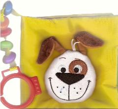 Miękka książeczka z tkaniny z szeleszczącymi stronami, piszczałką i grzechotką stymulująca rozwój najmłodszych dzieci. Zapakowana w plastikową walizeczkę z rączką.