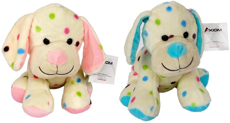 Pluszaki posiadają ciepłe, pastelowe kropeczki, różowe lub niebieskie łapki i noski.