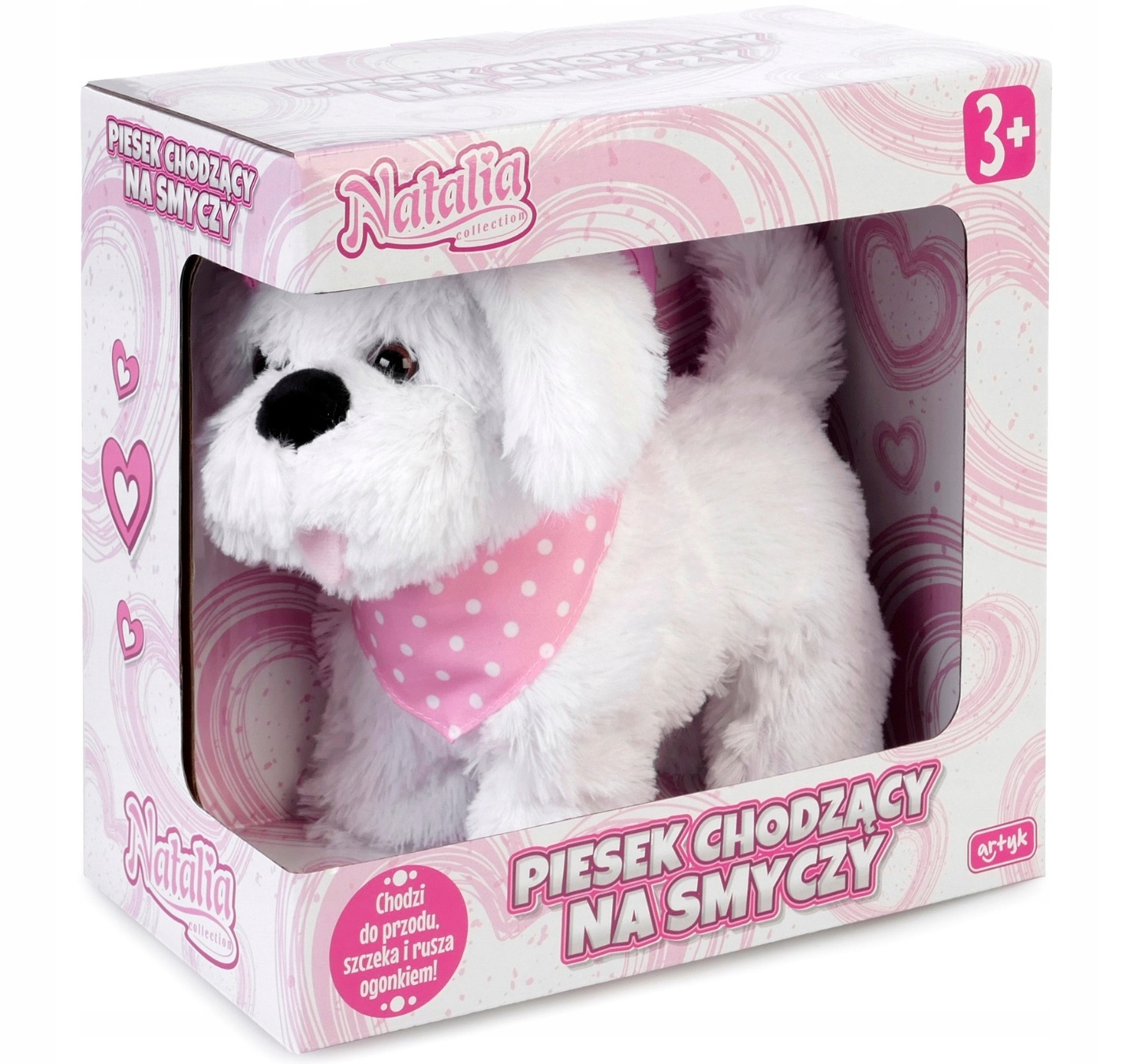 Opis produktuZasady bezpieczeństwaPiesek udekorowany różową chustką oraz różową kokardką w białe kropki. Ma wielkość 21 cm. Piesek posiada różne funkcje: chodzi, szczeka, merda ogonkiem. Do pieska dołączono różową smycz. Na opakowaniu znajduje się instrukcja obsługi smyczy. Zabawka wymaga 3 baterii AA 1,5V (nie dołączono do zestawu). x