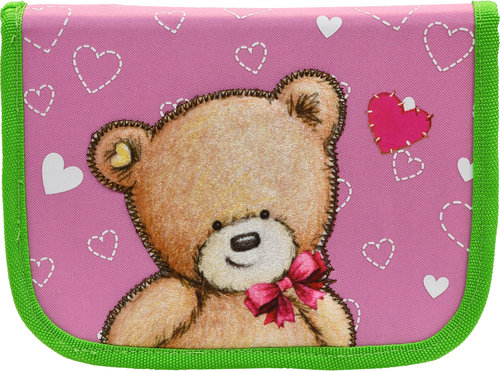Wykonany z najwyższą dokładnością i starannością piórnik jednosuwakowy dwuklapkowy na licencji Popcorn The Bear. Wewnątrz obszyty mocnym materiałem z kolorowym zadrukiem w serduszka, łatwym w czyszczeniu. Dokładnie wykończone suwaki sprawiają, że przestajemy się bać o utratę suwaka już w pierwszych godzinach użytkowania. Dzięki tak solidnemu wykonaniu jest doskonałą propozycją dla dzieci zaczynających swą przygodę w szkole lub w przedszkolu. Uroczy design z naszywką pluszowego Misia z zewnątrz pozwala cieszyć oko za każdym razem gdy się na niego spojrzy. Dostępny w dwóch różnych wersjach: jasny oraz ciemny róż. Wyposażenie: