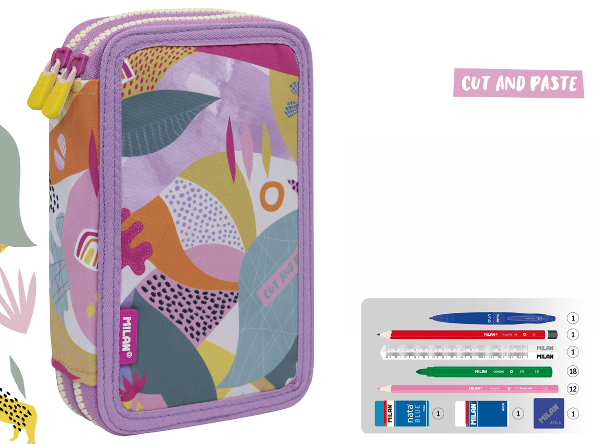 Wyposażenie w całości składa się z oryginalnych produktów MILAN: długopis CAPSULE UNO niebieski, ołówek sześciokątny HB, linijka trójkątna 15 cm, 18 flamastrów, 12 kredek trójkątnych, temperówka, 2 gumki do ścierania. Przy produkcji piórników użyto najlepszych materiałów, bardzo wytrzymałych suwaków oraz wzmocnionych nici. Niepowtarzalne wzornictwo. Wymiary piórnika: 19,5 x 13 x 5 cm. Nowość: materiał wierzchni i podszewka 100% poliester z recyklingu. Zużyte butelki plastikowe są przetwarzane w przędzę poliestrową pochodzącą z recyklingu, aby stworzyć materiał na nasze saszetki, piórniki, torby i plecaki. W piórnikach MILAN znajdziesz m. in.: Kredki ołówkowe cienkie o średnicy grafitu 2,9 mm o ergonomicznym trójkątnym kształtcie. Posiadają unikalny system Lead Protection System (LPS), który zwiększa odporność grafitu na złamania poprzez przyklejenie go do drewna. Drewno jest wytrzymałe i miękkie umożliwiając łatwe temperowanie. Wysokiej jakości pigmenty w żywych, intensywnych kolorach są odporne na działanie światła. Kreska wykonana kredką MILAN jest miękka, jednolita o wyraźnym odcieniu. Nie tworzy rowków ani nie niszczy papieru. Drewno pochodzi ze zrównoważonych plantacji. Każda kredka ma nadrukowaną nazwę koloru po angielsku. Kredki MILAN są zgodne z europejskimi i amerykańskimi normami bezpieczeństwa. Nie zawierają ftalanów, metali ciężkich i innych substancji toksycznych. Flamastry z wytrzymałą i elastyczną stożkową końcówką o średnicy 5 mm, która nie wpada do środka nawet przy silnym nacisku. Po chwilowym odkształceniu końcówka zawsze wraca do pierwotnego kształtu. Pozwala na rysowanie cienkich i grubych linii od 0,75 mm do 3 mm. Tusz na bazie wody tworzy jaskrawe i intensywne kolory, które można ze sobą mieszać. Tusz można łatwo wyprać z większości tkanin (moczyć tkaninę w zimnej wodzie przez godzinę, a następnie prać w pralce w niskiej temperaturze). Bezpieczna wentylowana skuwka umożliwia oddychanie w przypadku połknięcia. Flamastry MILAN są zgodne z europejskimi i amerykańskimi normami bezpieczeństwa. Nie zawierają ftalanów, metali ciężkich i innych substancji toksycznych. Są bezpieczne dla dzieci. Temperówkę z bezpiecznym przykręconym ostrzem dzięki czemu ostrze nie oddzieli się od obudowy temperówki. Miękkie gumki z syntetycznym kauczukiem i plastikowe. x