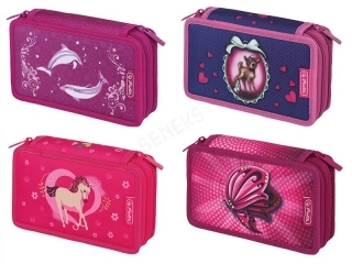 Piórnik podwójny na zamek, 23 częśći: 8 kredek, 8 flamastrów, 2 ołówki HB, długopis, gumka, temperówka, linijka, ekierka. Seria Girls, mix wzorów.