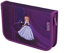 Piórnik z wyposażeniem: 14 flamastrów, 10 kredek, długopis z niebieskim wkładem, gumka, temperówka, linijka, ekierka, plan lekcji. Zapinany na zamek. Producent Herlitz.