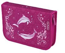 Piórnik z wyposażeniem: 14 flamastrów, 10 kredek, długopis z niebieskim wkładem, gumka, temperówka, linijka, ekierka, plan lekcji. Zapinany na zamek. Producent Herlitz.