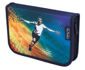 Piórnik z wyposażeniem: 14 flamastrów, 10 kredek, długopis z niebieskim wkładem, gumka, temperówka, linijka, ekierka, plan lekcji. Zapinany na zamek. Producent Herlitz.