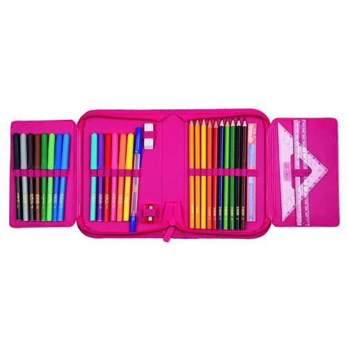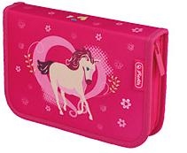 Piórnik z wyposażeniem: 14 flamastrów, 10 kredek, długopis z niebieskim wkładem, gumka, temperówka, linijka, ekierka, plan lekcji. Zapinany na zamek. Producent Herlitz.
