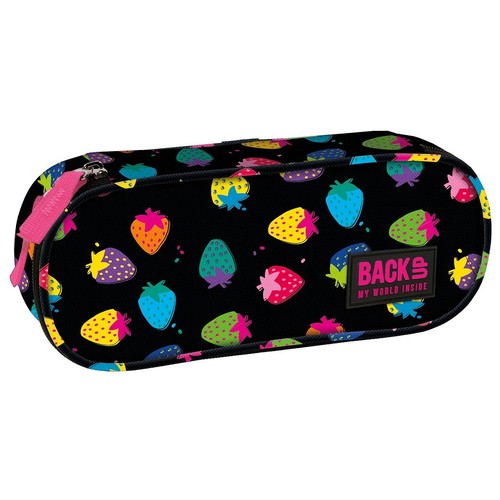 Piórnik BackUP model A 05 w inspirowane twórczością Andy'ego Warhola truskawki w intensywnych barwach na czarnym tle. Piórnik dla tych, którzy kochają słodycz lata i intensywne kolory.