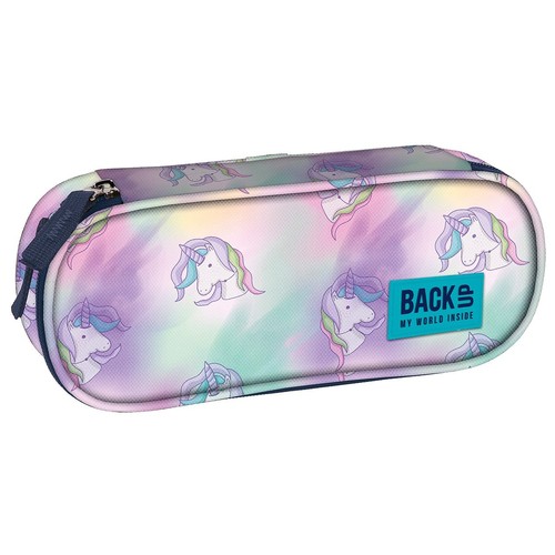 Piórnik BackUP model A 15 w jednorożce, które od jakiegoś czasu są niekwestionowanymi ulubieńcami młodzieży przedstawiono w nowoczesnej formie na tle w kolorach holi, które przywodzi na myśl nieskrępowaną zabawę kolorami, wakacje i letnie festyny.