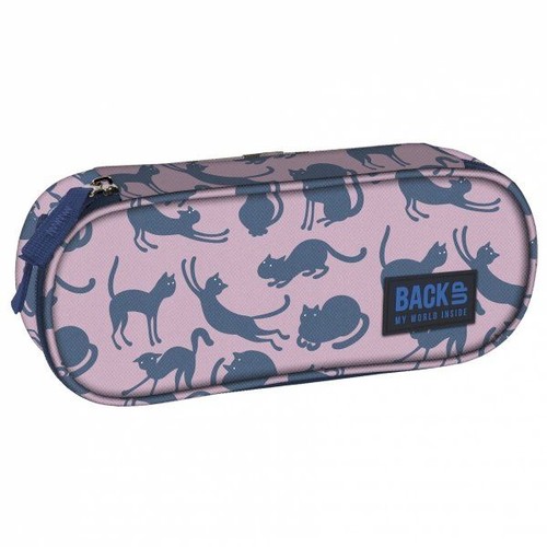 Piórnik BackUP model A 18 duże szaro - niebieskie koty w zabawnych pozach przestawiono na różowym jasnym tle w pastelowej tonacji.