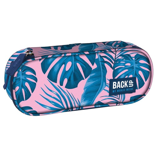 Piórnik BackUP model A 20 wzór inspirowany naturą, gdzie na różowym tle widnieją supermodne, uwielbiane przez influencerów liście monstery w intensywnym niebieskim kolorze.