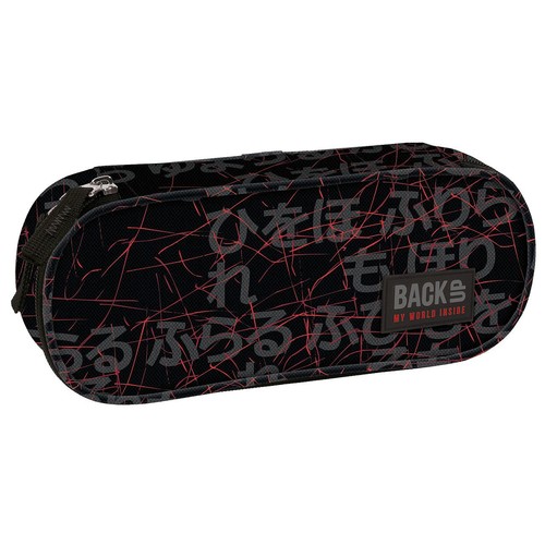 Piórnik BackUP model A 47 czarne tło, japońskie litery w szarym kolorze i czerwone rysy, wzór jednocześnie spokojny, ale z niewątpliwą nutką szaleństwa, którą podkręcają czerwone dodatki.