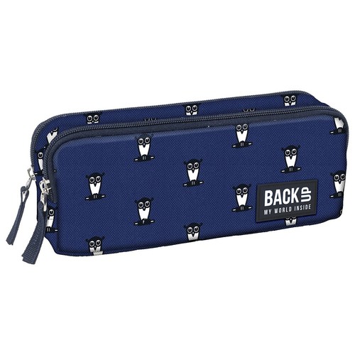 Piórnik BackUP model B 13 granatowe tło na którym pojawiają się malutkie czarno-białe sówki. Wzór w klasycznych barwach granatu ożywiony białymi elementami.