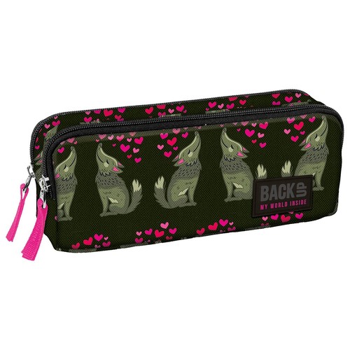 Piórnik BackUP model B 52 w najsłodsze, zakochane wilczki jakie mieliście okazję poznać są bohaterami najnowszej kolekcji. Spokojna, stonowana kolorystyka w odcieniach khaki została wykończona różowymi serduszkami.