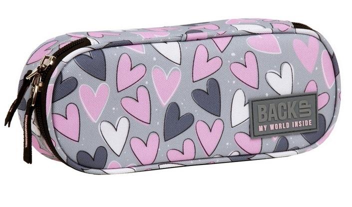 Szary piórnik jednokomorowy w różowe, białe i ciemno szare serduszka.