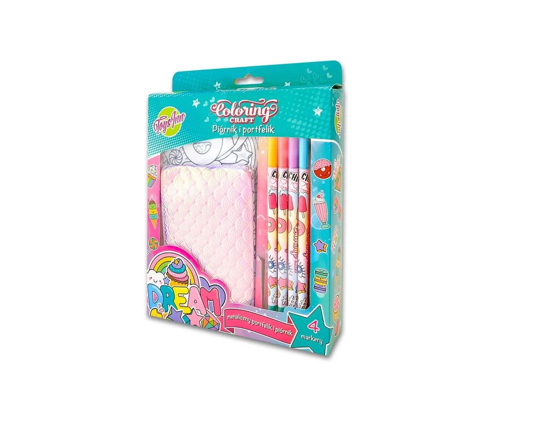 Opis produktuZasady bezpieczeństwaZestaw do kolorowania z piórnikiem i portfelikiem. Portfelik i piórnik z jednej strony wtkończone modnym, różowym i błyszczącym materiałem. Z drugiej strony portfelika/piórnika znajduje się rysunek z diamentowym wzorem do pokolorowania. W zestawie cztery markery do materiałów. x