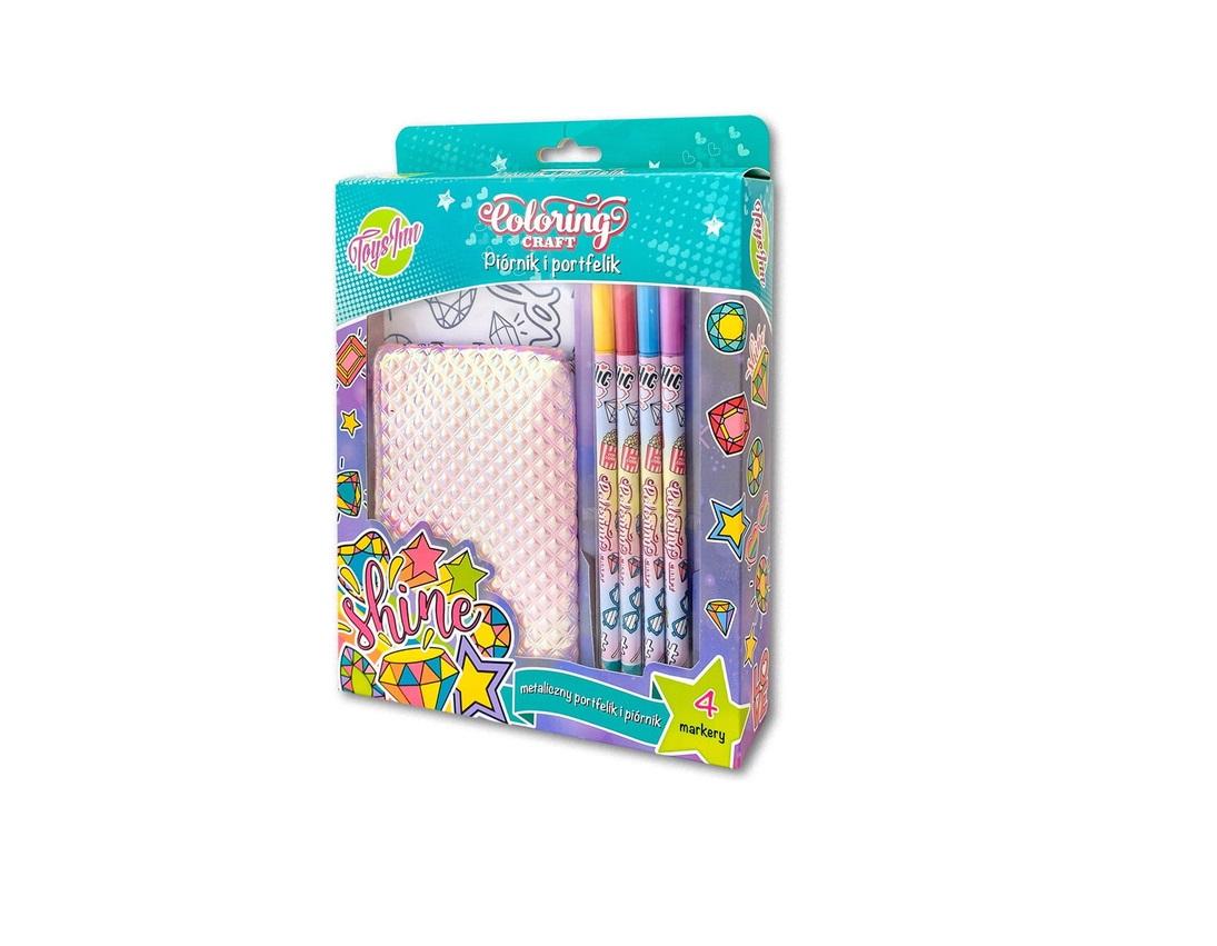 Opis produktuZasady bezpieczeństwaZestaw do kolorowania z piórnikiem i portfelikiem. Portfelik i piórnik z jednej strony wtkończone modnym, różowym i błyszczącym materiałem. Z drugiej strony portfelika/piórnika znajduje się rysunek z caticornowym wzorem do pokolorowania. W zestawie cztery markery do materiałów. x