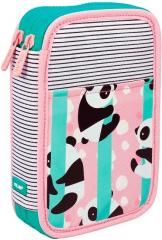 Piórnik MILAN 2-poziomowy z wyposażeniem Kolekcja PANDY. Idealny do domu lub szkoły. Wyposażenie: 12 kredek trójkątnych, 18 flamastrów ze stożkową końcówką, długopis P1, ołówek trójkątny HB, temperówka AFILA, 2 gumki syntetyczne, linijka trójkątna.
