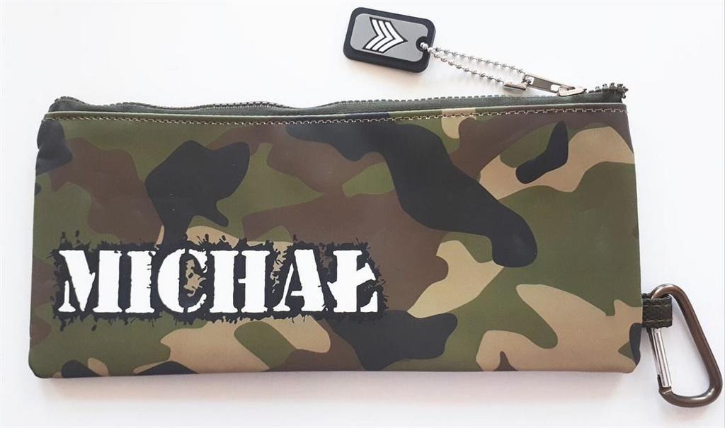 Dodatkowo do piórnika dołączona jest zawieszka w kształcie "nieśmiertelnika" oraz karabińczyk.
