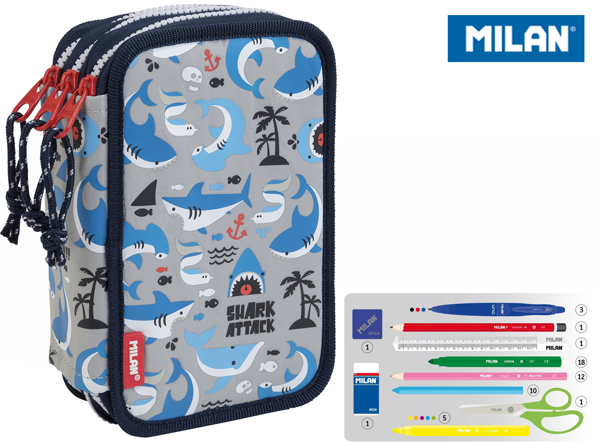 Opis produktuZasady bezpieczeństwaStojący piórnik MILAN z kolekcji Shark Attack z suwakiem w kolorze czerwono-szarym. Idealny do postawienia na biurku. Materiał: poliester na zewnątrz i podszewka. Rozmiar: 21 x 11,5 x 8 cm. x