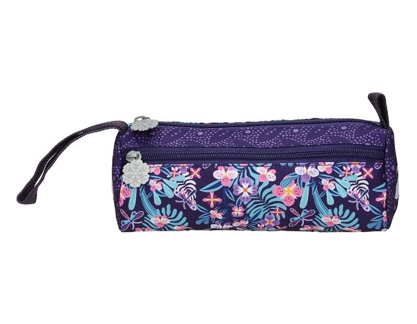 Duży piórnik w kształcie tuby z dwoma kieszeniami zapinanymi na suwak.