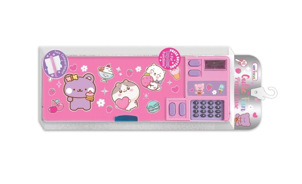 Opis produktuZasady bezpieczeństwaNietypowy wielofunkcyjny piórnik z akcesoriami! Każdy przycisk otwiera nową przegródkę do schowania różnych drobiazgów. Piórnik zawiera dwie zamykane komory na przybory szkolne, jedną szufladkę, 1 mini-pojemnik, wysuwany podstawowy kalkulator, wysuwaną temperówkę. Wiek: 5+