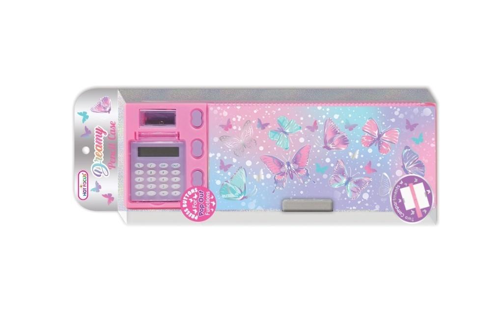 Opis produktuZasady bezpieczeństwaNietypowy wielofunkcyjny piórnik z akcesoriami! Każdy przycisk otwiera nową przegródkę do schowania różnych drobiazgów. Piórnik zawiera dwie zamykane komory na przybory szkolne, jedną szufladkę, 1 mini-pojemnik, wysuwany podstawowy kalkulator, wysuwaną temperówkę. Wiek: 5+
