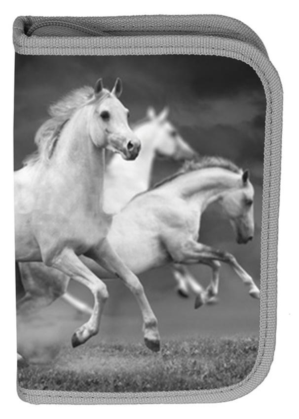 Piórnik z wyposażeniem Paso Horse szary w kwiatki. Piórnik jednokomorowy posiada zadrukowane, kolorowe wnętrze oraz zaopatrzony jest w dwie klapy z wyposażeniem. W środku znajduje się długopis, ołówek, 7 pisaków, 9 kredek, gumka, linijka, temperówka oraz ekierka. W Paso dbamy, aby nasze piórniki były funkcjonalne i ułatwiały organizację przyborów szkolnych podczas lekcji.