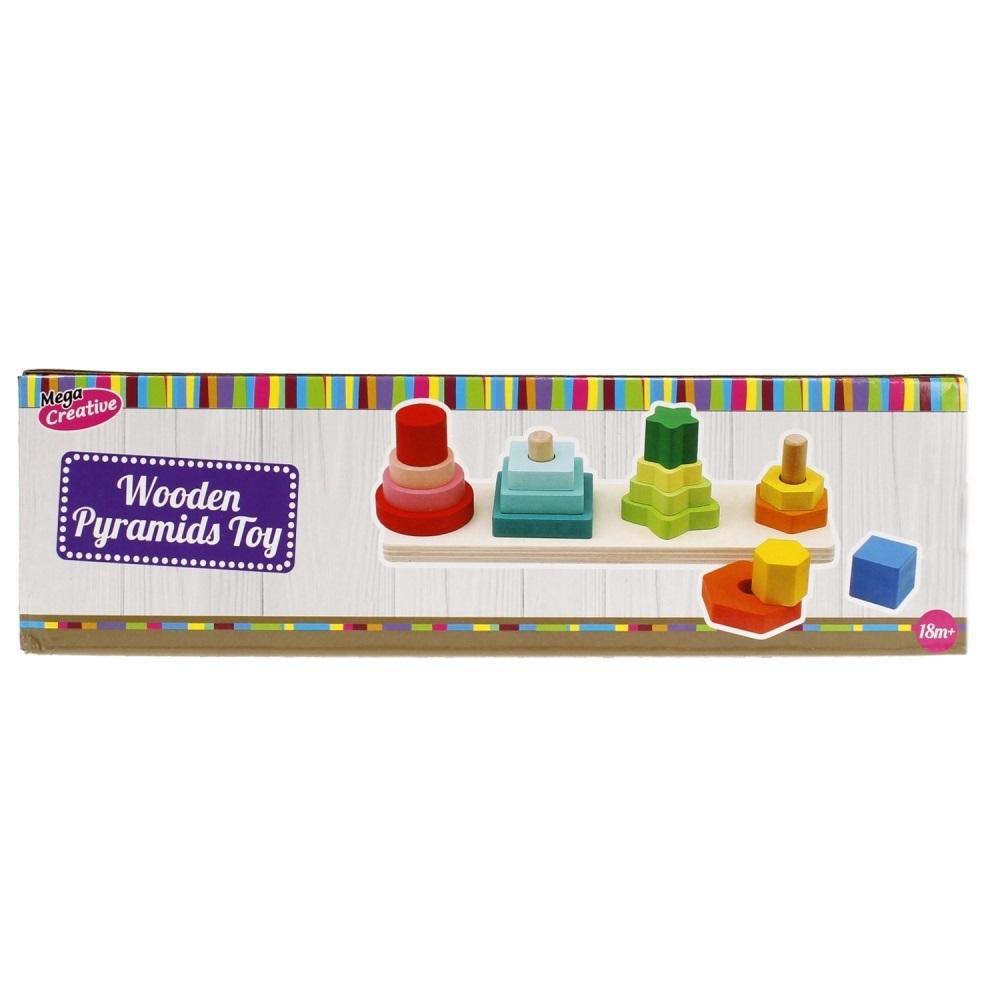 Opis produktuZasady bezpieczeństwaZalety produktu: zabawka polega na układaniu na sobie 4 różnokolorowych klocków drewnianych na 4 palikach ustawionych obok siebie, piramidka składa się z podstawki na której znajdują się 4 paliki po 4 klocki na każdym, 16 klocków w różnych kolorach oraz kształtach. W celu poprawienia zdolności ruchowo-myślowych swojej pociechy, sięgnij po kolorową piramidkę MEGA CREATIVE. Oprócz walorów czysto edukacyjnych, Piramidka zapewni dziecku mnóstwo wspaniałej zabawy oraz rozwinie jego kreatywność a także dostarczy wiele emocji! Zawartość zestawu: 16 kolorowych klocków, 1 x podstawka. Całość wykonana z drewna. Wymiary/waga/baterie: wymiary produktu (dł. x wys. x gł.)[cm]: 27x8x8, wymiary opakowania (dł. x wys. x gł.) [cm]: 28x8x8, waga produktu bez opakowania [kg]: 0,35 kg, waga produktu w opakowaniu [kg]: 0,42 kg, nie wymaga zasilania bateriami. Zabawka przeznaczona dla dzieci w wieku: 18 m+. Piramidka pakowana w pudełko. x