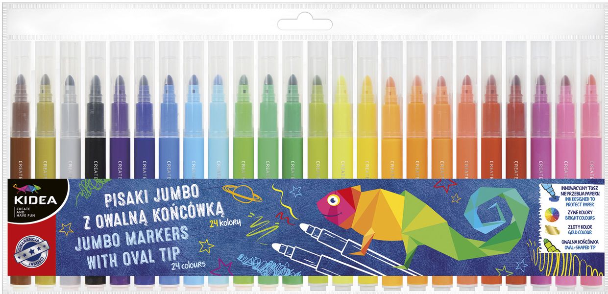 Aż 24 pisaki w rozmiarze jumbo z owalną końcówką w intensywnych kolorach. . Bardzo dobrze kryją większe powierzchnie, są niełamliwe, mają bardzo wytrzymałą końcówkę. Dodatkowo zastosowano innowacyjny tusz, który po nałożeniu dwóch warstw kolorów na siebie nie dziurawi papieru. Bardzo okazały zestaw, doskonały na prezent.