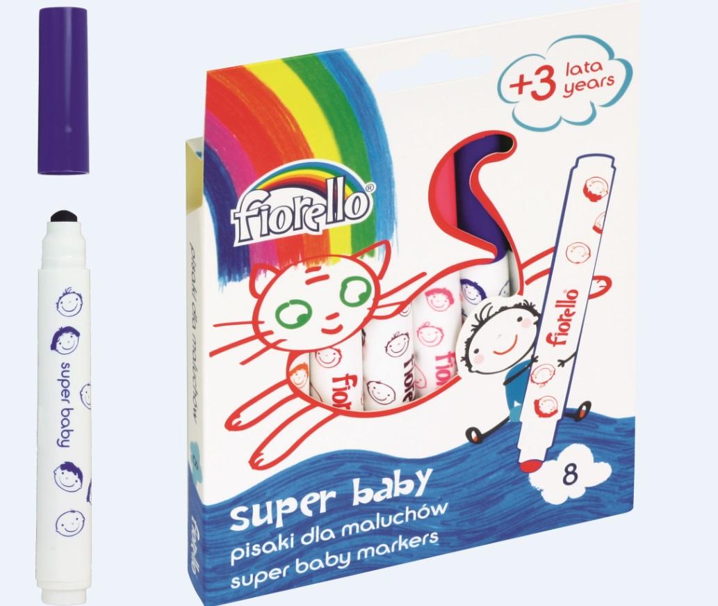 przeznaczone dla małych dziecikrótka, zaokrąglona końcówka umożliwia łatwe kolorowanie dużych powierzchnikońcówka wyposażona w blokadęnie ma możliwości wciśnięcia jej do środkabezpieczna wentylowana zatyczka umożliwia oddychanie w przypadku połknięciaspieralnezgodne z normą CE