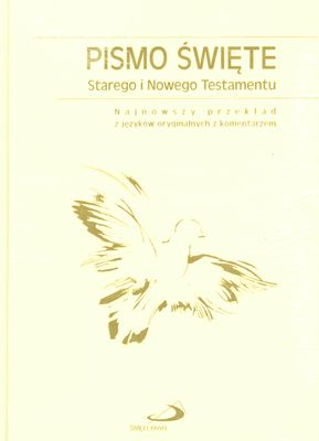 Najnowszy przekład Pisma Świętego z komentarzem opracowany przez Zespół Biblistów Polskich z inicjatywy Towarzystwa Świętego Pawła. Pismo Święte dla całej rodziny - pierwszy przekład w trzecim tysiącleciu.Idea i cechy najnowszego przekładu Pisma Świętego: Maksymalna wierność tekstowi oryginalnemu, z uwzględnieniem w tłumaczeniu zasad współczesnego literackiego języka polskiego. Dbałość o to, aby jak najlepiej oddać po polsku sens oryginalnego tekstu biblijnego. Uwzględnienie w tłumaczeniu i komentarzach do tekstu biblijnego współczesnych badań nad Pismem Świętym. Unikanie w przypisach i komentarzach specjalistycznego języka teologicznego. Umieszczenie przed każdą księgą, a także przed zbiorami ksiąg (np. Ewangelie) zwięzłych wprowadzeń, pozwalających czytelnikowi uchwycić kontekst powstania danej księgi lub zbioru ksiąg, a także istotę zawartej w nich treści. Nowoczesny i przejrzysty układ graficzny pozwalający sprawniej korzystać z Pisma Świętego, tzn.: - biała, estetyczna oprawa ze złotym wyciskiem,- przypisy z informacjami koniecznymi do zrozumienia tekstu biblijnego, umieszczone na zewnętrznych marginesach stron,- komentarze do poszczególnych fragmentów, na które podzielony jest tekst biblijny, ukazujące główne myśli oraz przesłanie w nich zawarte, - odnośniki do innych miejsc w Biblii, umieszczone na wewnętrznych marginesach stron,- skrócone nazwy ksiąg wraz z zakresami tekstu biblijnego, umieszczone w dolnych rogach stron, ułatwiające szukanie wybranego miejsca w Piśmie Świętym. - słownik wyjaśniający 186 terminów biblijnych, tablice chronologiczne i mapy, które przybliżają kontekst historyczny i geograficzny wydarzeń biblijnych.