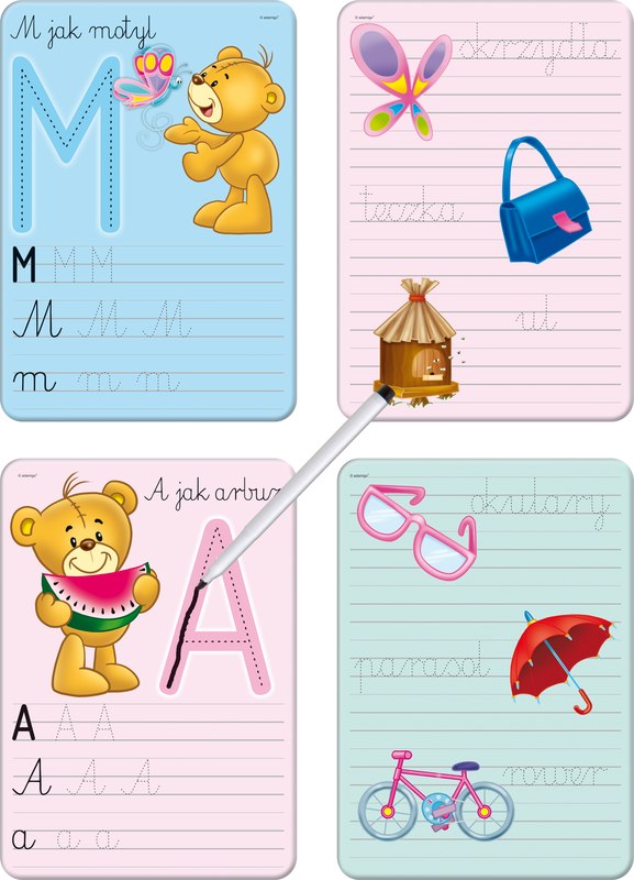 Ćwiczenie to ułatwia suchościeralny marker, którym można pisać nawet krzywo i nie w linijce, gdyż szmatka to wszystko szybko zmaże i znów można próbować napisać prostą i piękną literkę