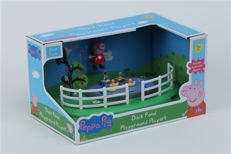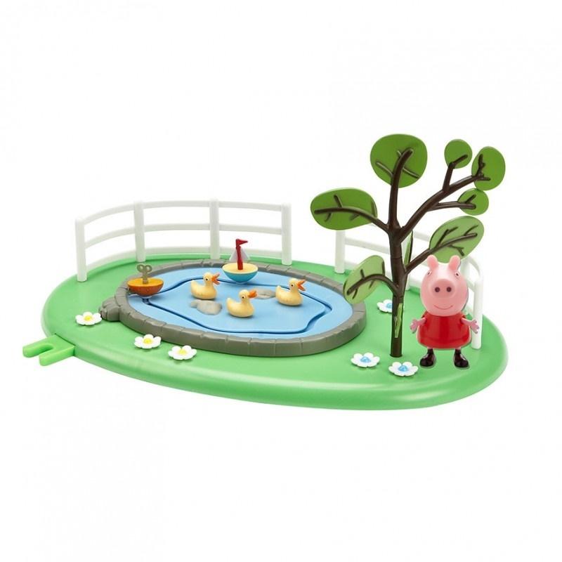 Zestaw zawiera figurkę świnki i scenkę - staw z ruchomymi elementami.