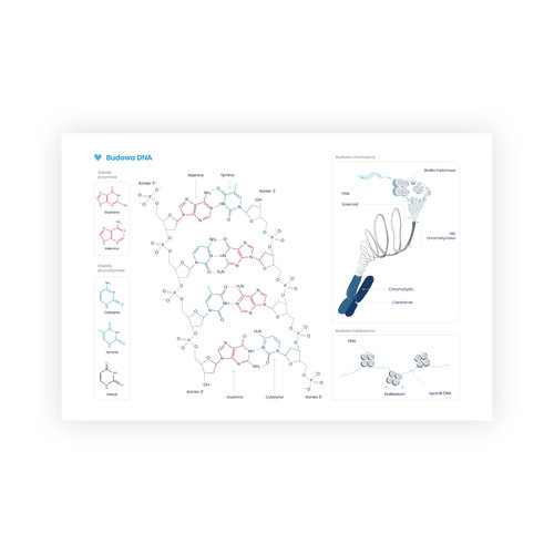 ŚWIETNA POMOC NAUKOWA Na plakacie znajduje się szczegółowy opis budowy DNA z podziałem na zasady purynowe i pirymidynowe, a także szczegółowy schemat budowy chromatyny oraz nukleosomu.