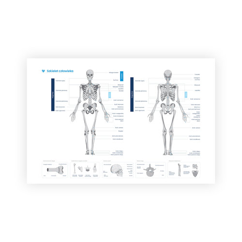 ŚWIETNA POMOC NAUKOWA Na plakacie znajdują się opisy nazw kości szkieletu człowieka, a także szczegółowy opis budowy kości, podział kości ze względu na kształt, szczegółowy opis budowy czaszki człowieka, szczegółowy opis budowy kręgu oraz rodzaje połączeń międzykostnych.