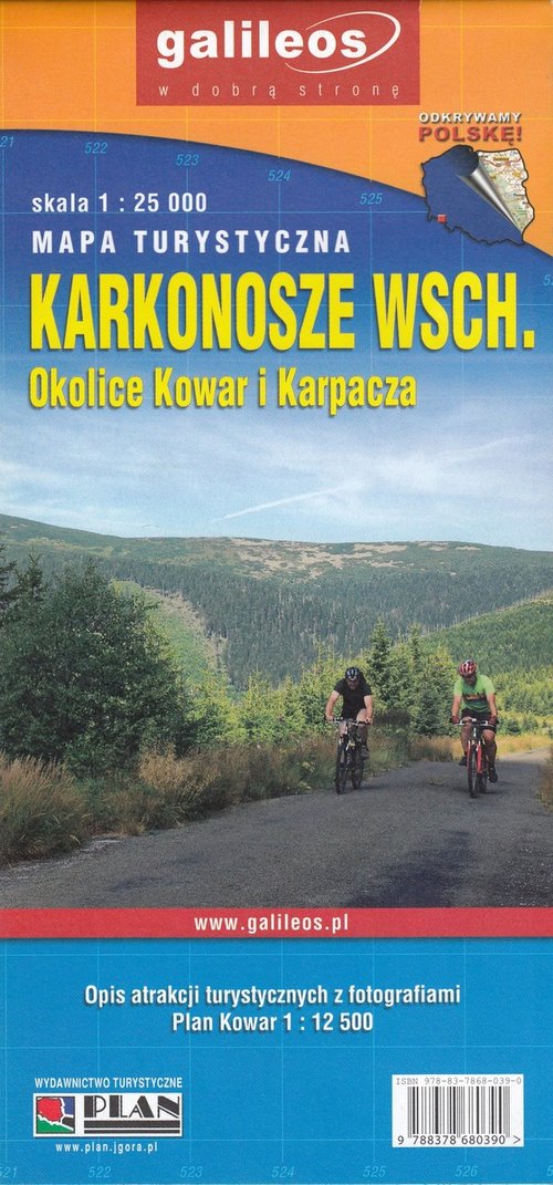 Szczegółowa mapa turystyczna wschodniej części Karkonoszy z opisem najważniejszych atrakcji. Na rewersie mapy plan Kowar z Parkiem Miniatur Zabytków Dolnego Śląska.