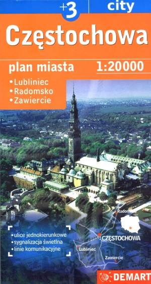 Plan Częstochowy w skali 1:20 000 plus centrum w skali 1:10 000, wzbogacony o plany najważniejszych miast w okolicy.- Ulice jednokierunkowe- Strefy ruchu pieszego- Sygnalizacja świetlna- Linie komunikacyjne (autobusowe, tramwajowe)- Spisy ulic i informacje teleadresowe okolicznych miast- Szlaki turystyczne i ścieżki rowerowe.