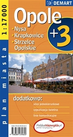 Plan Opola w skali 1:17 000 plus centrum w skali 1:10 000, wzbogacony o plany najważniejszych miast w okolicy.- Ulice jednokierunkowe- Strefy ruchu pieszego- Sygnalizacja świetlna- Linie komunikacyjne- Spisy ulic i informacje teleadresowe- Szlaki turystyczne- Rysunki i opisy wybranych zabytków Opola.
