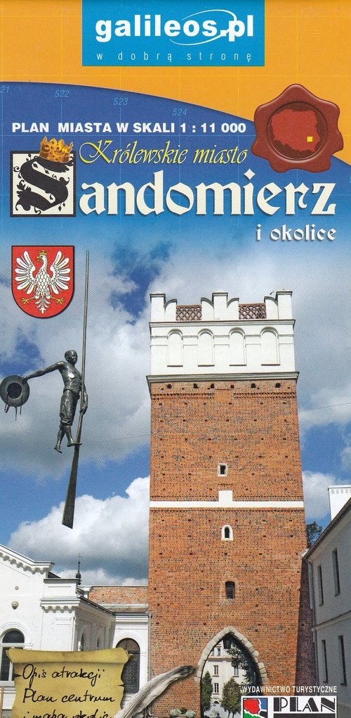 Aktualne wydanie dwustronnego planu Sandomierza w wygodnej dla użytkownika skali 1:9 000, z dodatkową mapą okolic miasta oraz dokładnym planem sandomierskiej Starówki w skali 1:5 000. Znakomicie opracowane od strony kartograficznej, zawierają mnóstwo szczegółów przydatnych w dobrym zaplanowaniu przejazdu lub pobytu. Oprócz tradycyjnego schematu z ulicami, charakterystycznymi punktami, infrastrukturą kulturalną, usługową, noclegową itp. zaznaczono tu także schemat komunikacji miejskiej oraz szlaki turystyczne. Rewers mapy przeznaczono na zdjęcia najważniejszych atrakcji turystycznych i krajoznawczych miasta wraz z ciekawym i kompetentnym opisem.