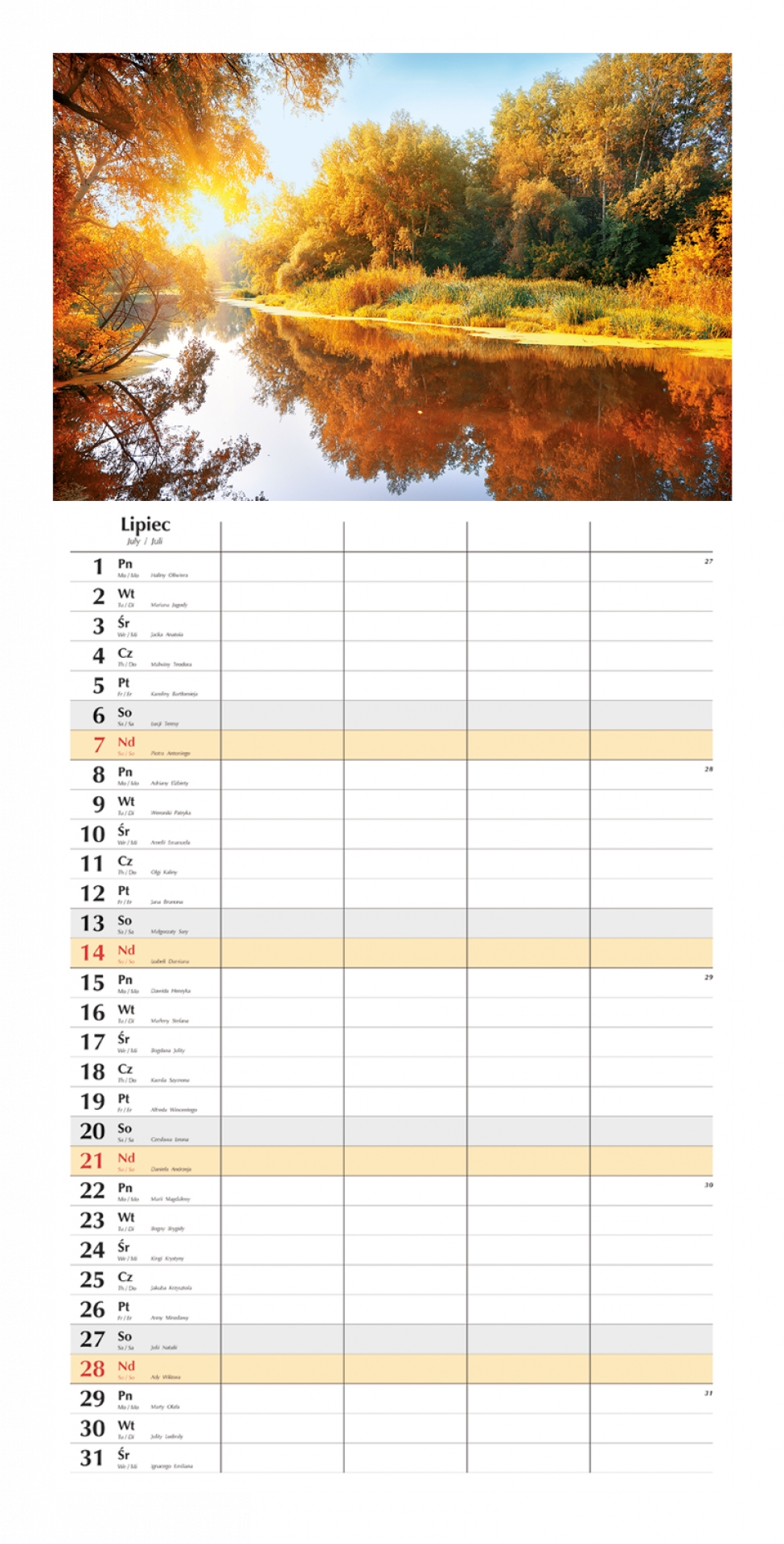 Opis produktuZasady bezpieczeństwaformat: 290x471 mm rodzaj papieru: offset 80g/m2 biały układ kalendarium: 1 miesiąc - 1 strona ilość stron: 12 druk: pełnokolorowy