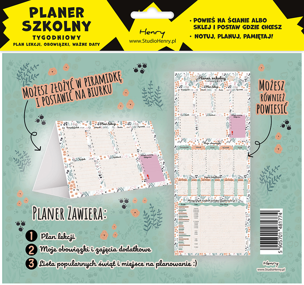 Opis produktuZasady bezpieczeństwaPlaner składa się z trzech stron użytkowych, na każdej ze stron: Plan lekcji, Moje obowiazki i zajęcia dodatkowe, Lista ważnych dat do zaplanowania, wszystko w jednym miejscu.Format trójstronnej piramidki 160x210mm po sklejeniu do użytku w wersji stojącej, bez klejenia do użytku w wersji ściennej 160x516mm.