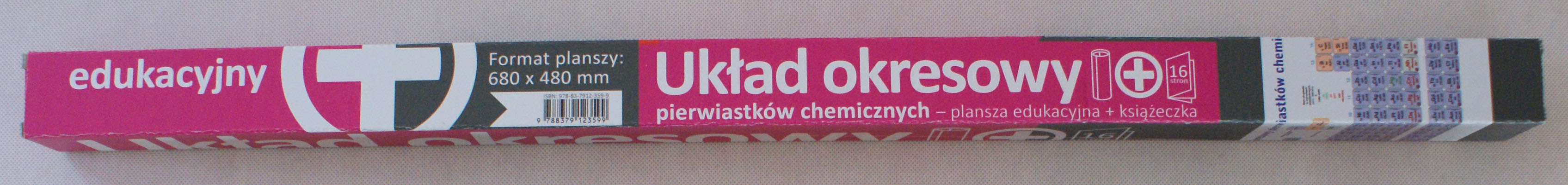 oraz z wieloma innymi danymi. Informacje podstawowe: symbol, nazwa polska, liczba atomowa, masa atomowa oraz zaawansowane: konfiguracja elektronowa na powłokach głównych, elektroujemność w skali Paulinga. Ponadto będą zaznaczone właściwości pierwiastków: podział na metale i niemetale, a w ramach tych ostatnich wyróżnione są gazy szlachetne; stan skupienia w warunkach standardowych oraz promieniotwórczość, w tym z wyróżnieniem uzyskanych laboratoryjnie izotopów. Będzie przedstawionych 118 pierwiastków wraz z zaakceptowanymi nazwami (pod koniec 2016) tych o liczbie atomowej od 113 wzwyż. II strona posłuży wyjaśnieniu: czym są grupy i okresy w układzie okresowym pierwiastków oraz do czego wykorzystujemy poszczególne dane zawarte na stronie I charakteryzujące pierwiastki. Dodatkowo będzie wyjaśnione dlaczego nie są zbadane właściwości pierwiastków umieszczonych na końcu układu. Format ksiażeczki: 14,5x20,5x0,2 cm. x